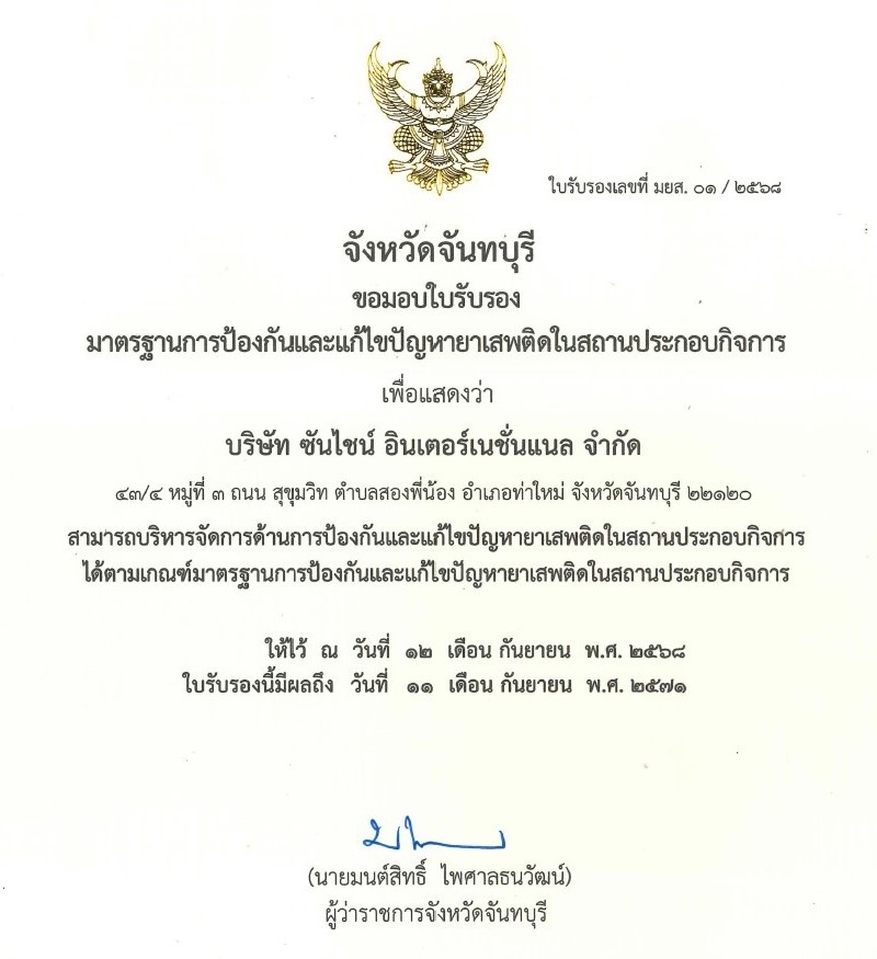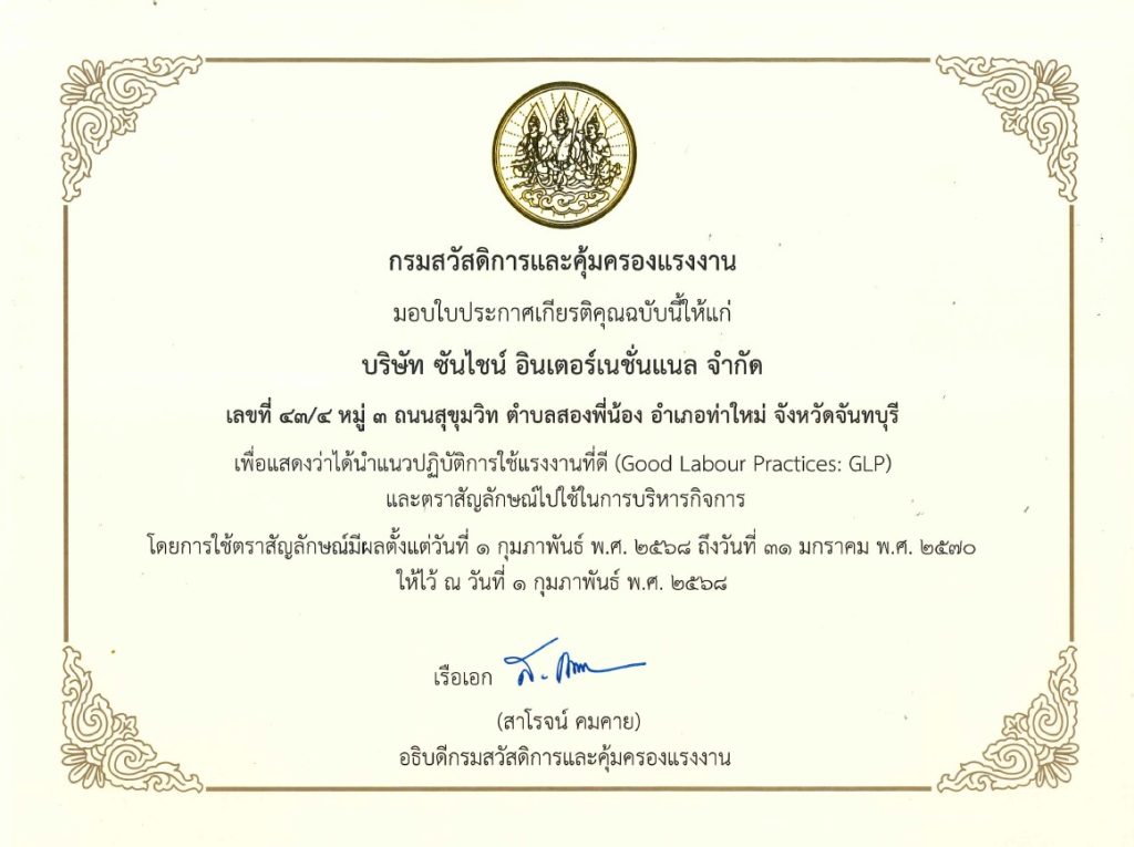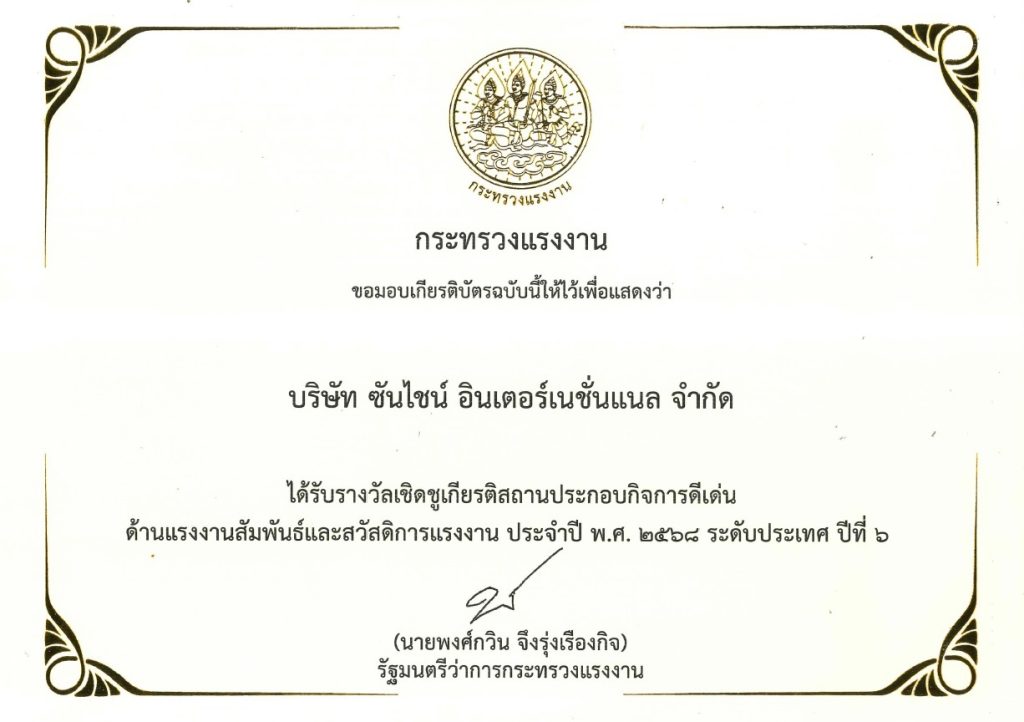 Sunshine International Co., Ltd. Receives Prestigious Awards for Labor Management and Welfare. On February 20, 2026, in Chanthaburi Province, Sunshine International Co., Ltd. was honored with certificates of recognition in the Social (S) category. The awards were presented by the Governor of Chanthaburi, Mr. Monsit Paisaltanawat, to the company’s representatives for the following achievements: